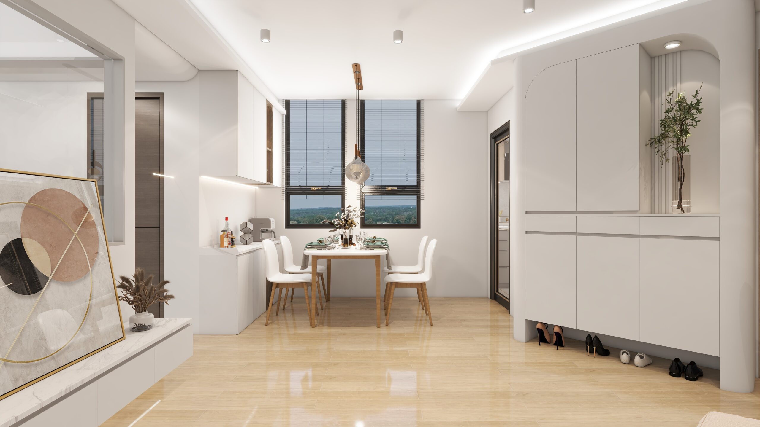 靠窗區域是餐廳,擺放著一張淺色餐桌,配四把白色餐椅,桌上有餐具和裝飾花藝,上方懸垂著幾盞簡約吊燈 。大窗戶裝有百葉簾,可調式光線,窗外可看到遠景。